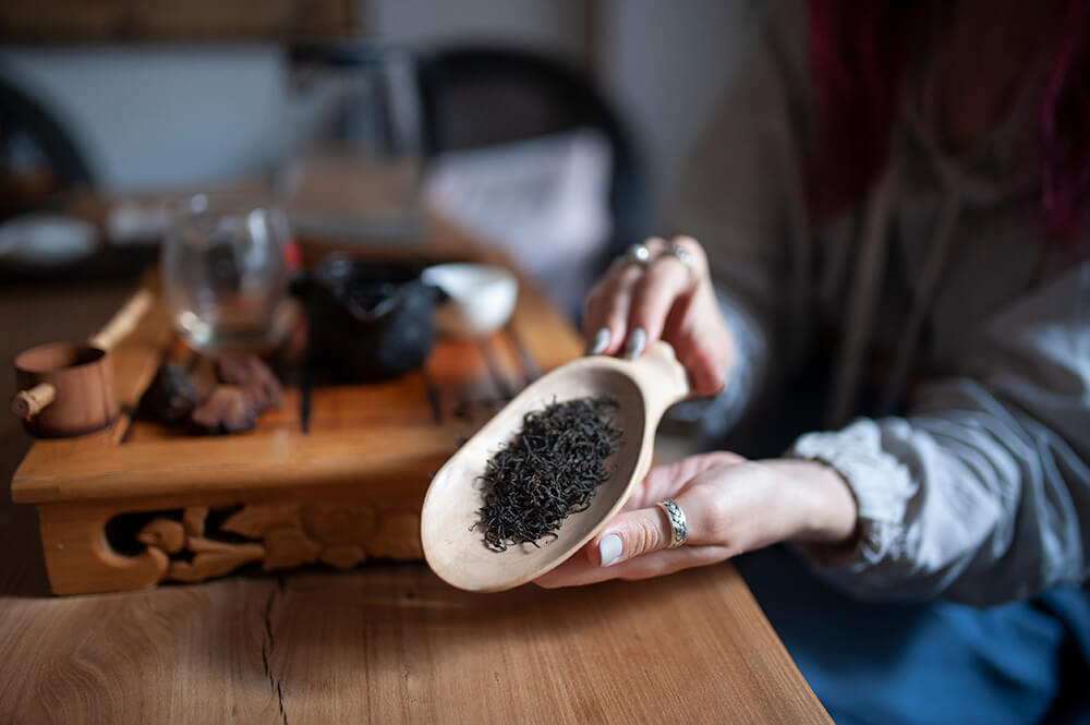 Аккуратные тонко скрученные чаинки черного цвета. Аромат теплый, ржаной, c кондитерской сладостью, за которой стоит аристократичный дух огня — специфическая черта Исин Хун Ча.