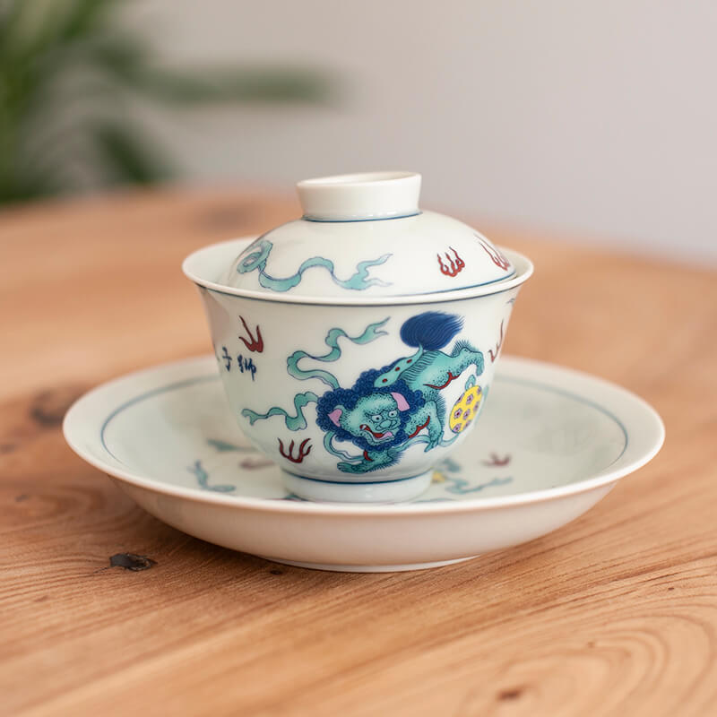 Фарфоровая гайвань с изображением мифических зверей. С большим блюдцем, хотя сама гайвань небольшая. Ёмкость 140 мл.