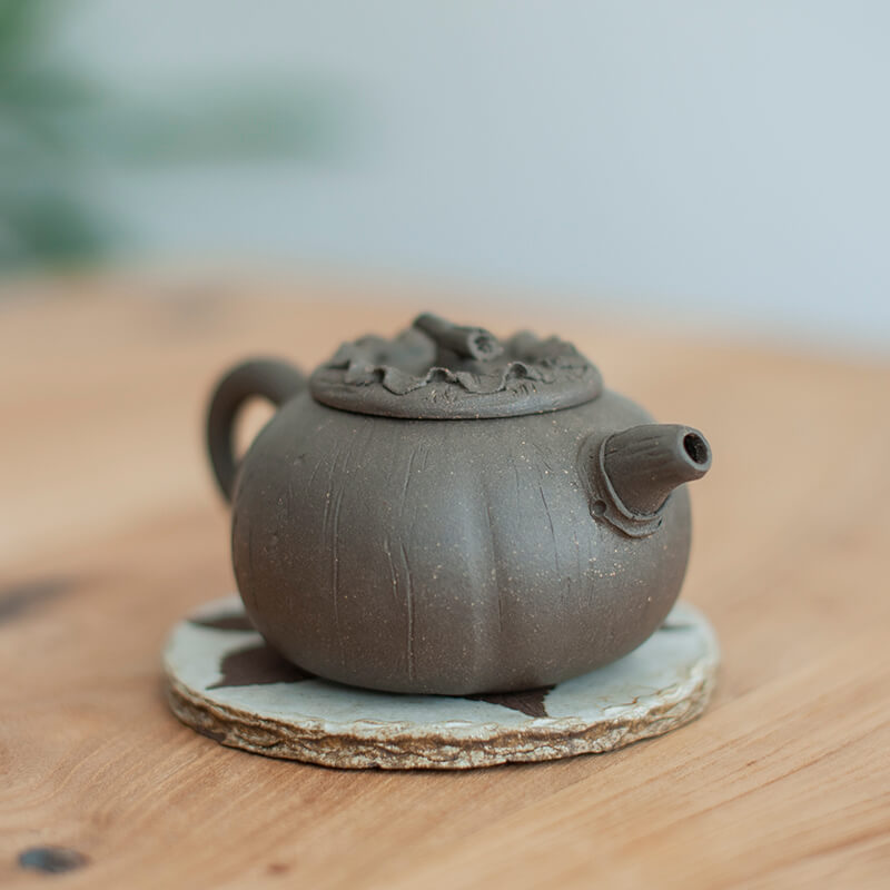 Объёмный чайник из серо-графитной глины, сделанный в форме большой тыквы. Ёмкость 190 мл, слив 15 секунд.