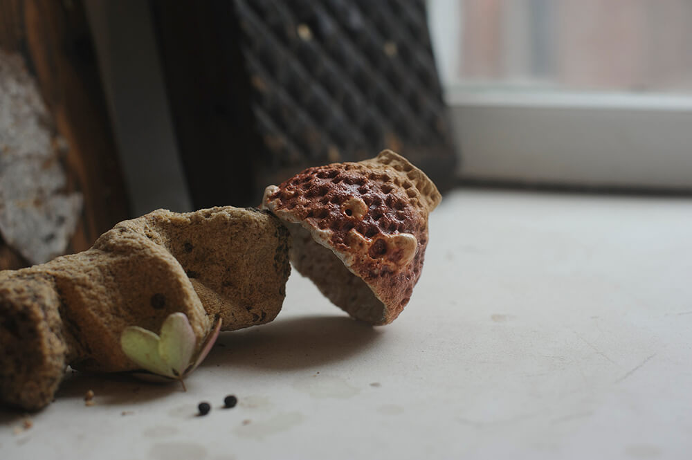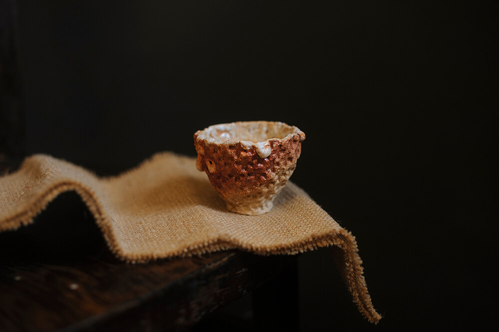 Выполнена из шамота, экспериментальный обжиг с солью. Оранжевый цвет пиалы получен без применения глазурей и пигментов: только ествественные изменения глины под воздействием огня.