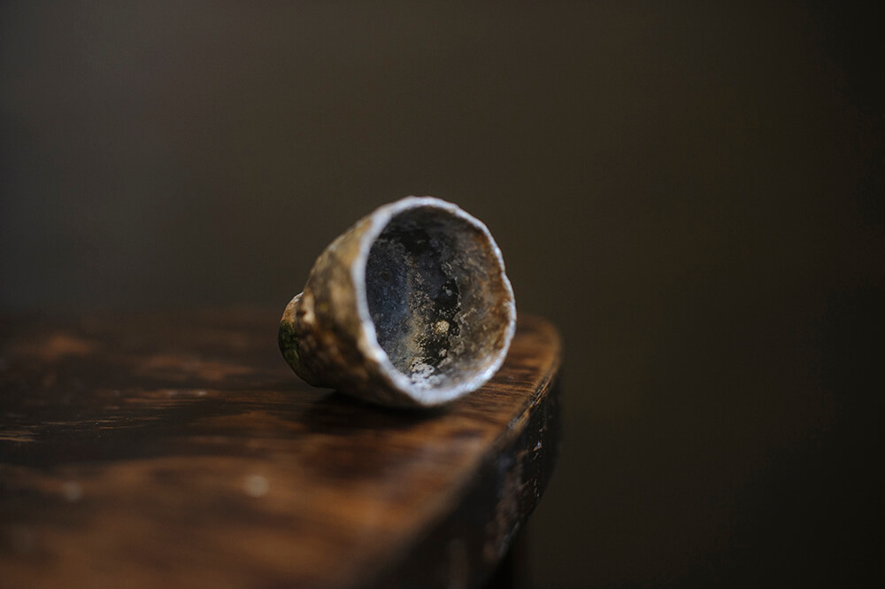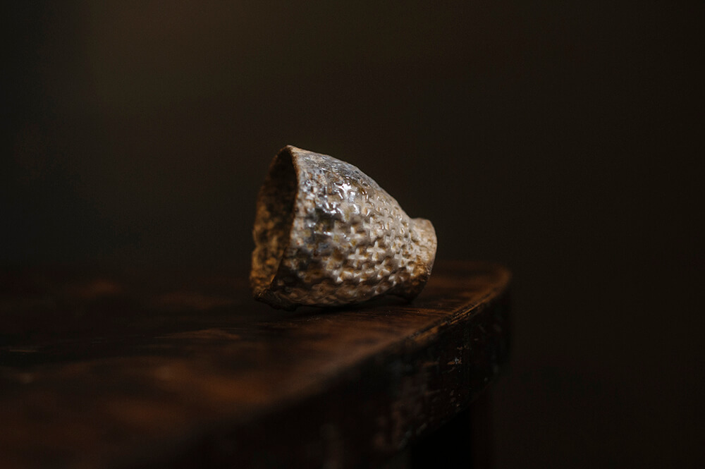 Стояла в первых рядах, у самого пламени. Под воздействием пламени фарфор окрасился в тёмно-серые оттенки, зола превратилась в стеклянные капли. Белые пятнышки — срезы, обнажающие материал.