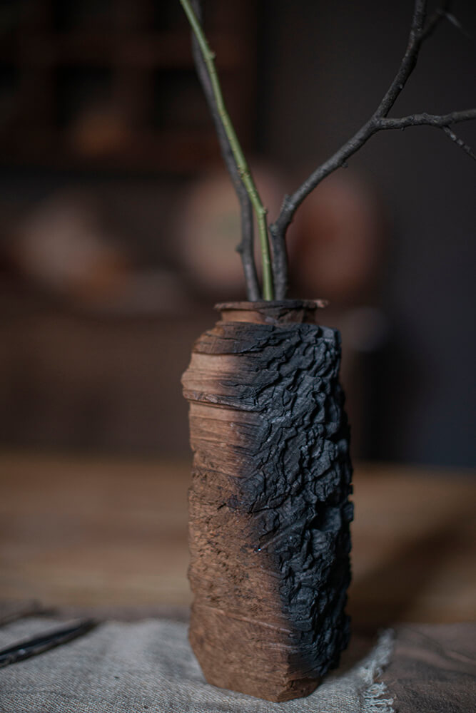 В процессе работы с материалом в мастерской используется токарная обработка и ручные резцы. Иногда используется огонь для естественной тонировки (японская техника якисуги).
