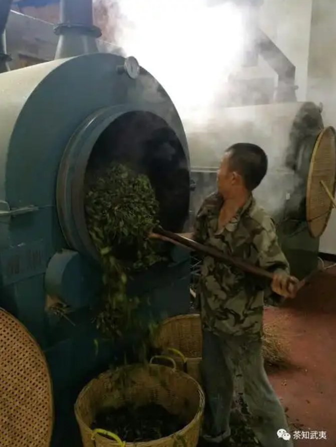 После инактивации ферментов томление чередуется с разбрасыванием, при этом упор делается на разбрасывание, чтобы обеспечить равномерную обработку листа, избежать перегрева, а также сформировать нужный аромат и цвет чая.