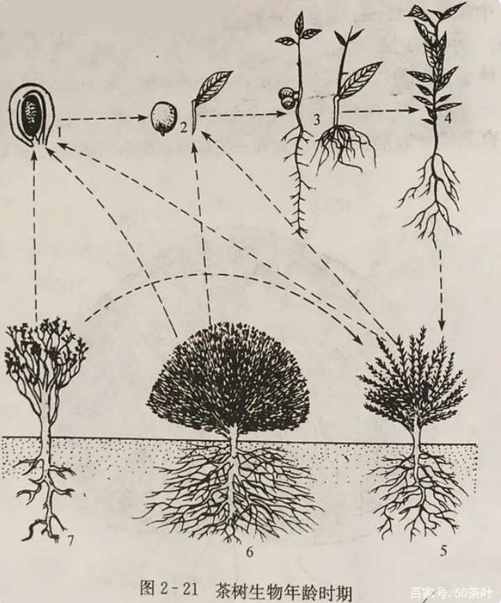 Общий цикл жизни чайного дерева включает в себя 5 стадий: стадия саженца, стадия детства, стадия юности, стадия зрелости и стадия старости.
