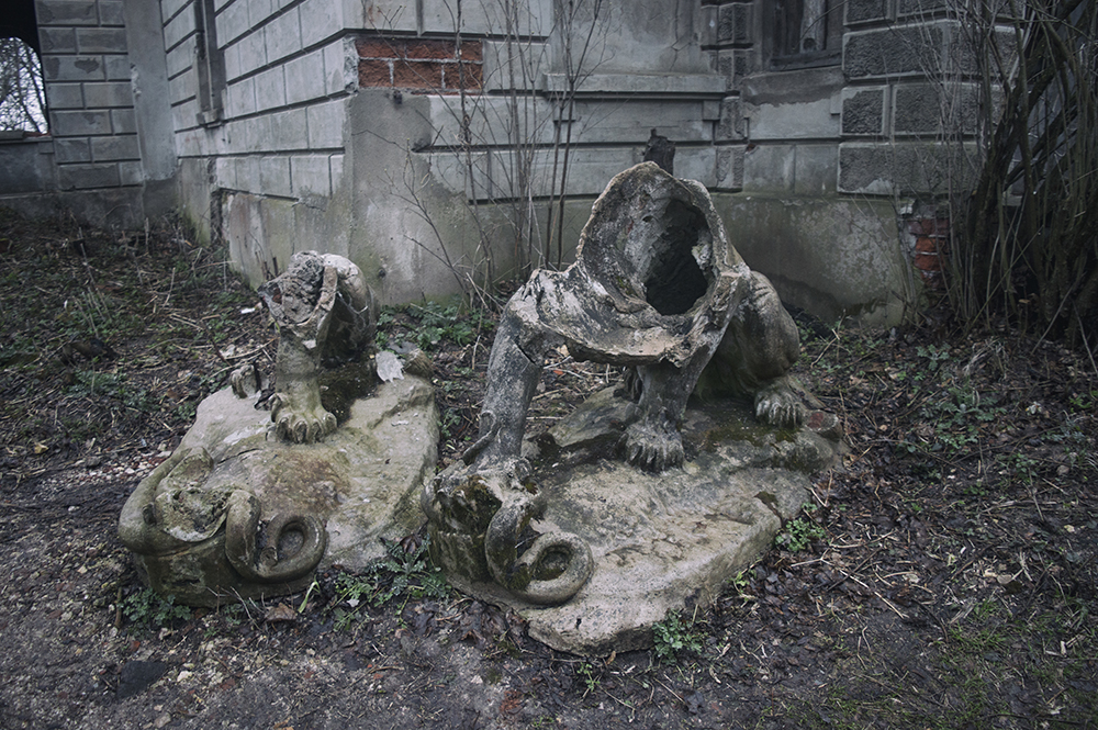 Вход в усадьбу охраняют останки львов. Из пристроек едва узнаются конюшня, птичник и сторожка.